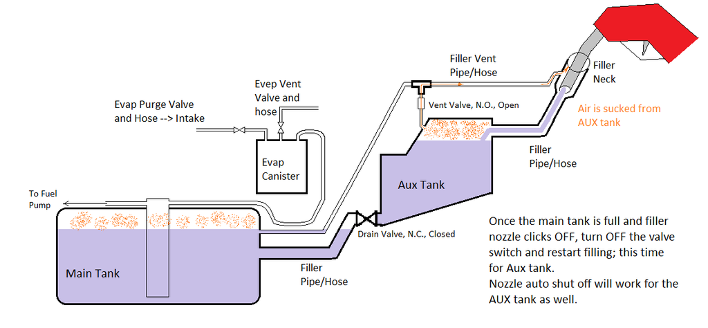 The auxiliary tank will be tied into the filler neck in two places. One point below to fill the auxiliary tank, and one above where the fuel from the auxiliary tank fuel pump comes in. If the OEM tank is full the fuel just recirculates. The OEM vent line will be tapped also by the auxiliary tank. When the OEM tank is filling-up you automatically begin fueling up the auxiliary tank. The fuel nozzle at the station should still work the same when the threshold is reached just like OEM. This is about the same exact system as some of the Chevy trucks with dual tanks employed.