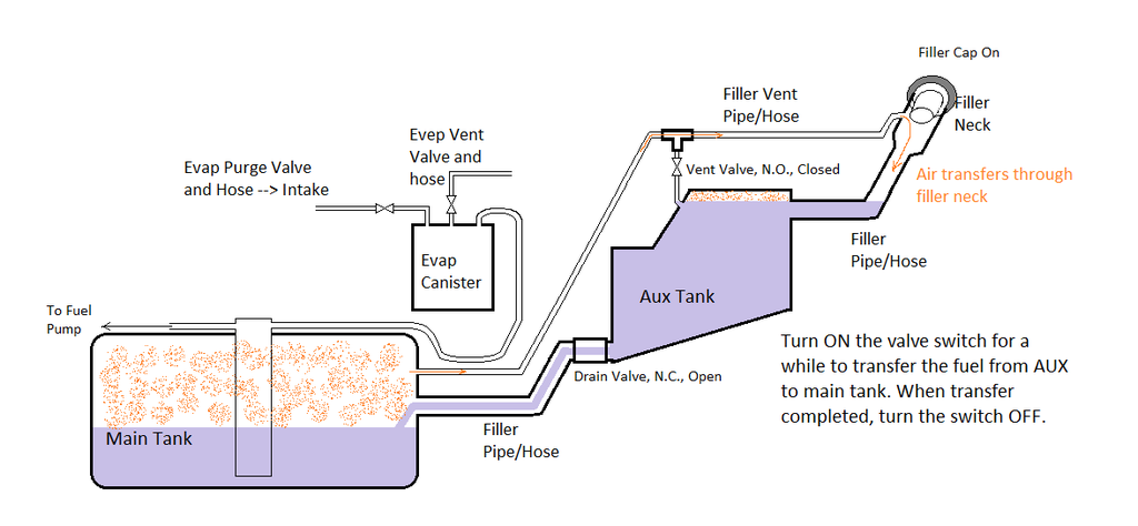 I looked into the gravity feed. I couldn't find a tank that would be oriented in such a way to make it work. Then, every forum I looked at said it was more trouble than it is worth. I can't remember the exact reasons, but it was either that it was slow to feed and drain unless it was situated above the main tank (plus the evap stuff), or that there was a desire to isolate the systems. If you have a tank that can make it work, it would be like running one big OEM tank I guess when connected. You could have a valve on a switch to initiate the feed and still isolate them if you wanted to, but you'd need them to fill separately.