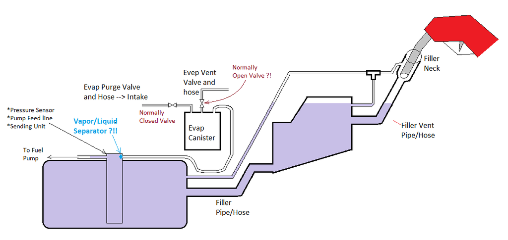 I had this discussion last week with the shop that's helping me with this. It's quite the conundrum isn't it? They came up with the following to remove the evap system from the equation. The tanks will be filled at the same time essentially but they must be more equally leveled. If this can't be maintained with where I want the auxiliary tank then I'll have to abandon the idea (see bottom of post) and opt for a slightly more costly method of separate systems. Anyway plan A is as follows: