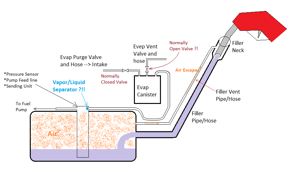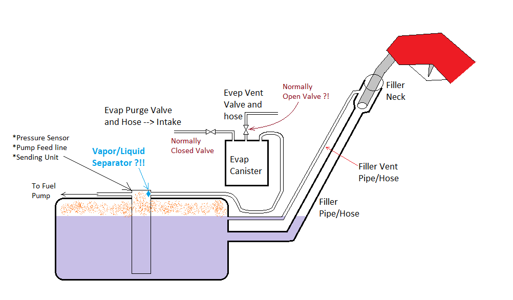 However, if the tanks can't be filled at the same time, plan B is to make the tanks two separate systems with two separate filler necks. This negates all issues of the evap system but requires an extra filler neck and needs a provision to recirculate the fuel if the pump is accidentally turned on and the OEM tank is full. The fuel pump from the Blazer should have a return line, I suppose that can be tied in above where the fuel sending line is.