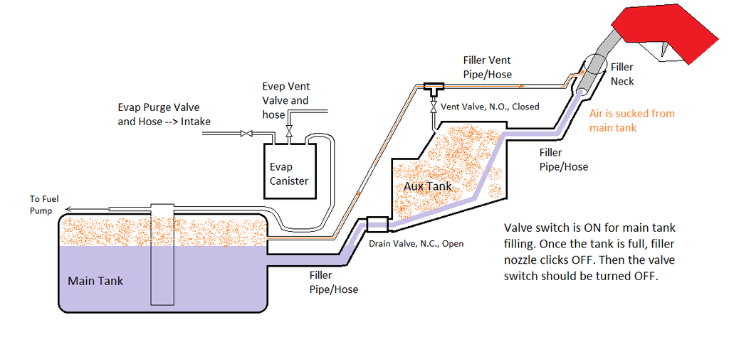 The aux. tank should fill up normally as well as the filler neck will be isolated. It will be as though the tank is in a Chevy Blazer. Hoping to have the filler neck on the rear plastic quarter panel or the rear bumper. As long as pressure is maintained I think you can also tie-in to the evap system with the aux. tank vent line. Still working out the details, but this is a slow going project.