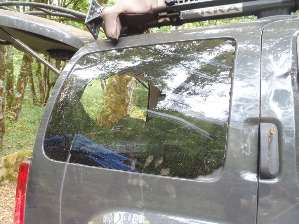 I took a little rest and my dad jumped in to help. We started using shims and made significantly faster progress. Using shims we got the sides almost done. At that point, my over-zealous father tried to pry the window out and that was when it smashed.